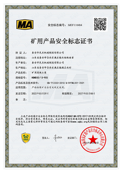 熱烈慶祝我廠礦用混凝土輸送泵通過產(chǎn)品安全標(biāo)志證書(煤安編號(hào):MEF110483、MEF110484、MEF110485)。目前公司成功研制出HBMD15/6-22S混凝土輸送泵、以下簡(jiǎn)稱“15立方混凝土泵”,且在銷售市場(chǎng)俏銷的形勢(shì)下乘勝前進(jìn),又試機(jī)成功**款新型的高壓大輸送量混凝土輸送泵HBMD30/13-90S混凝土輸送泵、HBMD80/16-110S混凝土輸送泵,目前已成功申辦“煤安標(biāo)志”,把產(chǎn)品推向市場(chǎng)。