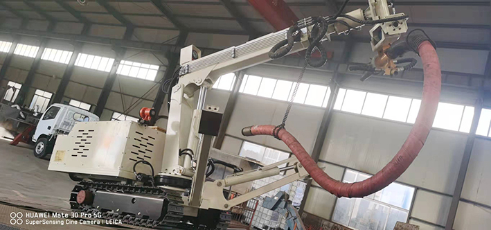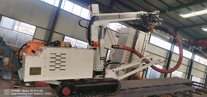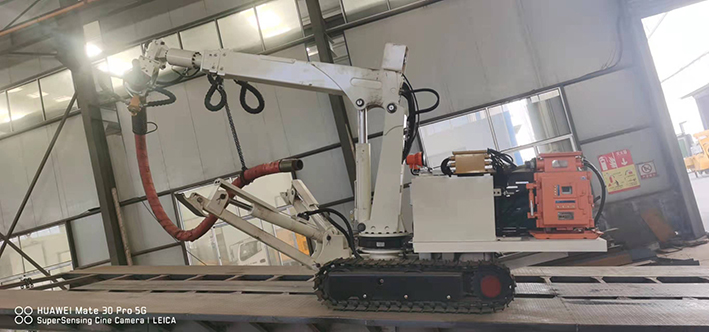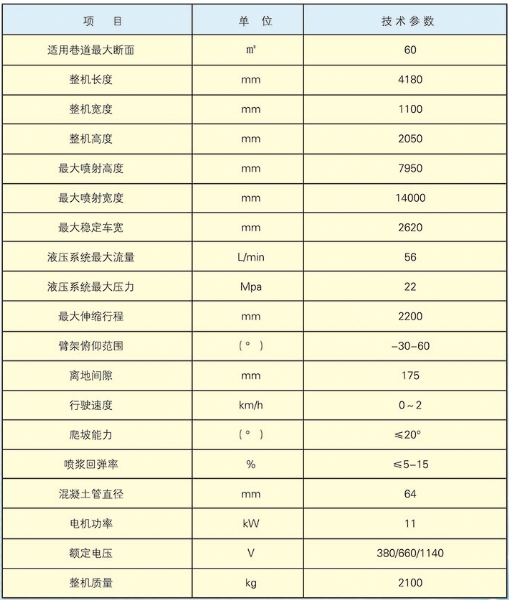 CPF-6OLY型礦用混凝土輔助噴射車(chē)(以下簡(jiǎn)稱噴漿機(jī)械手)主要用于煤礦井下煤巷、半煤巷、全巖石掘進(jìn)巷道與混凝土噴射機(jī)配套使用,代替人工噴漿作業(yè),滿足噴漿工藝要求,整機(jī)小巧、靈活、耐用、適應(yīng)能力強(qiáng),可用于大型噴漿機(jī)組無(wú)法進(jìn)入的巷道,實(shí)現(xiàn)噴漿無(wú)線操作、機(jī)械化作業(yè),減輕人工噴射勞動(dòng)強(qiáng)度大的問(wèn)題。整機(jī)完全采用無(wú)線遙控操作、液壓控制,工作性能安全可靠。下車(chē)液壓系統(tǒng)負(fù)責(zé)行走、上車(chē)液壓系統(tǒng)負(fù)責(zé)噴射,上下車(chē)動(dòng)作手動(dòng)切換,防止誤操作。整機(jī)具有結(jié)構(gòu)穩(wěn)定可靠,動(dòng)作平穩(wěn),噴射范圍大,自由度多,遙控操作靈活,噴射平整度好,回彈少,噴射效率高、施工質(zhì)量好,可實(shí)現(xiàn)遠(yuǎn)程控制,操作人員可位于在可視情況好、粉塵濃度少,較為安全的位置操作,保證使用人員安全。